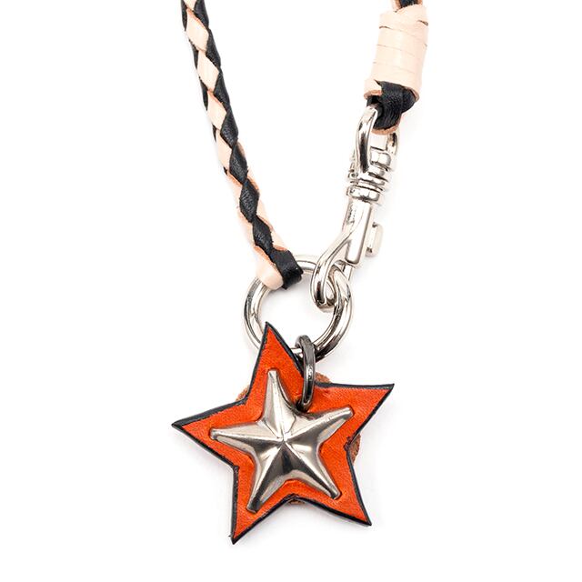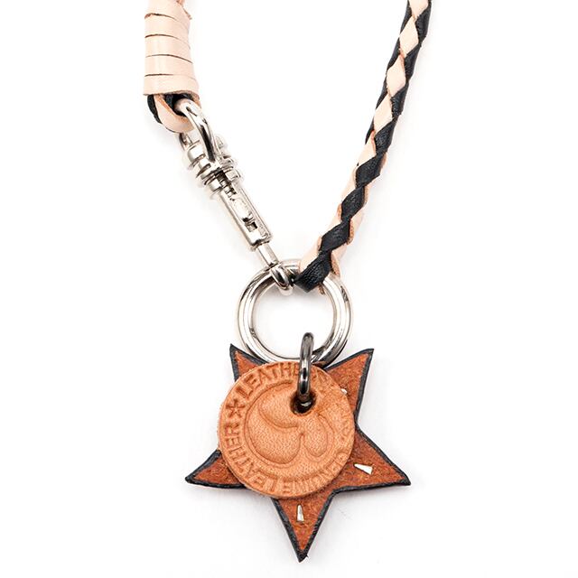 スターチャームの☆レザー部分を、ネックレスのトップにして、レザー編み込みのネックレス。カンガルーレースを編み込んでいるので、仕上がりも細くて丈夫です。首輪と一緒に着けても、かさばりません。編み込みレザー部分は、最大25cmまででオーダーして頂けます。金具部分は、およそ3cmなので、最長28cmになります。例:首回り27cmだと、編み込み部分は24cmでオーダーしてください。