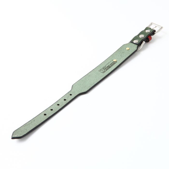 こちらの商品は、ドッグタグ一体型になっており、首輪の幅が30mm、バックルと剣先側が18mm幅になります。シンプルながら首輪本体の色・ベルトループの色・ドッグタグの色・剣先(首輪の先)・剣先に付属するスタッズの色(シルバーもしくはゴールド)を選べるのでオリジナルの首輪を製作出来ます。ドッグタグもアルファベットと数字で14文字×5列で刻印出来るので迷子札代わりになりますし、タグがアクセントになるのでスタイリッシュです。バックルやベルトループをカシメ(金具)で固定してますが、オプション(550円)で手縫い仕上げにも出来るので、デザインパターンが増やせます。首輪自体の強度は変わりません。こちらは、首輪本体が緑・ベルトループが赤・ドッグタグメッキあり・剣先ノーマル・スタッズ・シルバー・ドッグタグを付けるカシメ・ゴールドです。※受注生産になります。