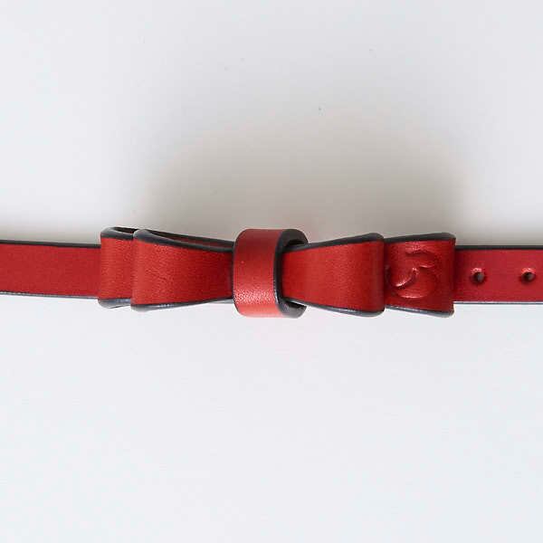 リボンの首輪。細いタイプのリボンですが、ボリューム良く取り付けてあります。パーツどうしも手縫いで縫い付けてあるので型崩れしづらいし、見た目以上に手が込んでいます。シンプルながら首輪本体の色・ベルトループの色・リボンの色・剣先(首輪の先)・剣先に付属するスタッズの色(シルバーもしくはゴールド)を選べるのでオリジナルの首輪を製作出来ます。バックルやベルトループをカシメ(金具)で固定してますが、オプション(550円)で手縫い仕上げにも出来るので、デザインパターンが増やせます。首輪自体の強度は変わりません。※極小サイズは、手縫い仕上げをおススメします。※写真は、剣先・ノーマル スタッズ・ゴールドなります。※受注生産になります。