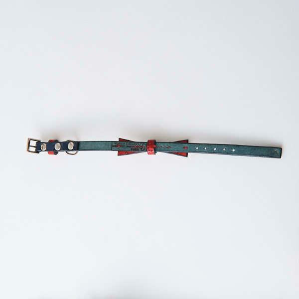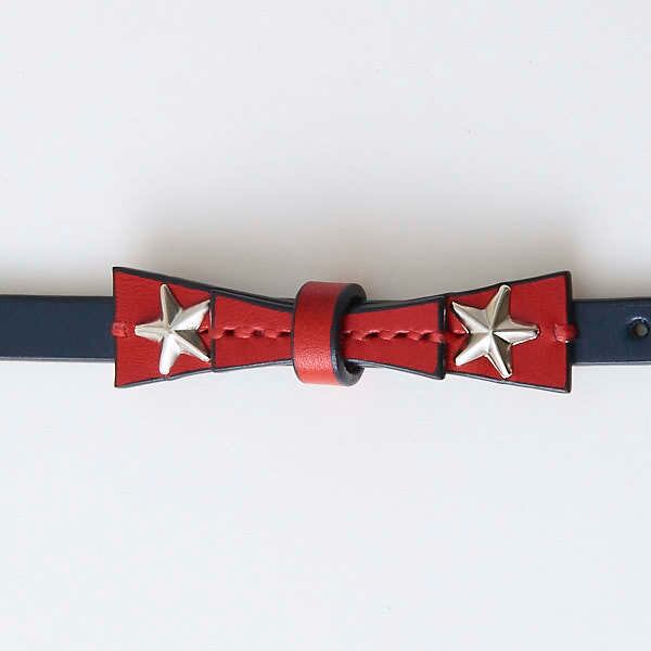 ロックテイストなリボンの首輪。細いタイプのリボンですが、リボン部分に星のスタッズが付いているのでインパクト大です。パーツどうしも手縫いで縫い付けてあるので型崩れしづらいです。シンプルながら首輪本体の色・ベルトループの色・リボンの色・剣先(首輪の先)・剣先に付属するスタッズと星のスタッズの色(シルバーもしくはゴールド)を選べるのでオリジナルの首輪を製作出来ます。バックルやベルトループをカシメ(金具)で固定してますが、オプション(550円)で手縫い仕上げにも出来るので、デザインパターンが増やせます。首輪自体の強度は変わりません。※極小サイズは、手縫い仕上げをおススメします。※写真は、剣先・カット スタッズ・ゴールド 星スタッズ・シルバーになります。※受注生産になります。