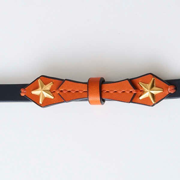 ロックテイストなリボンの首輪。細いタイプのリボンですが、リボン部分に星のスタッズが付いているのでインパクト大です。パーツどうしも手縫いで縫い付けてあるので型崩れしづらいです。シンプルながら首輪本体の色・ベルトループの色・リボンの色・剣先(首輪の先)・剣先に付属するスタッズと星のスタッズの色(シルバーもしくはゴールド)を選べるのでオリジナルの首輪を製作出来ます。バックルやベルトループをカシメ(金具)で固定してますが、オプション(550円)で手縫い仕上げにも出来るので、デザインパターンが増やせます。首輪自体の強度は変わりません。※写真は、首輪本体が黒、ベルトループとリボンのパーツがオレンジ、剣先・ノーマル スタッズ・ゴールド、星スタッズ・ゴールドになります。※受注生産になります。