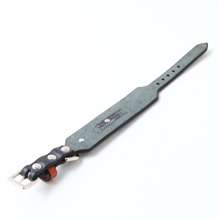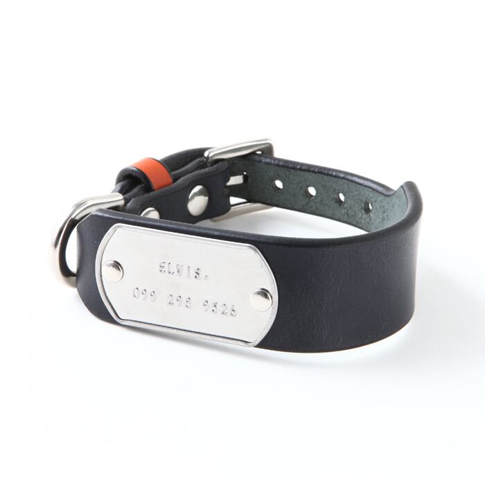 こちらの商品は、ドッグタグ一体型になっており、首輪の幅が30mm、バックルと剣先側が15mm幅になります。シンプルながら首輪本体の色・ベルトループの色・ドッグタグの色・剣先(首輪の先)・剣先に付属するスタッズの色(シルバーもしくはゴールド)を選べるのでオリジナルの首輪を製作出来ます。ドッグタグもアルファベットと数字で14文字×5列で刻印出来るので迷子札代わりになりますし、タグがアクセントになるのでスタイリッシュです。バックルやベルトループをカシメ(金具)で固定してますが、オプション(550円)で手縫い仕上げにも出来るので、デザインパターンが増やせます。首輪自体の強度は変わりません。こちらは、首輪本体が紺・ベルトループがオレンジ・ドッグタグメッキあり・剣先ノーマル・スタッズ・ゴールドです。※受注生産になります。