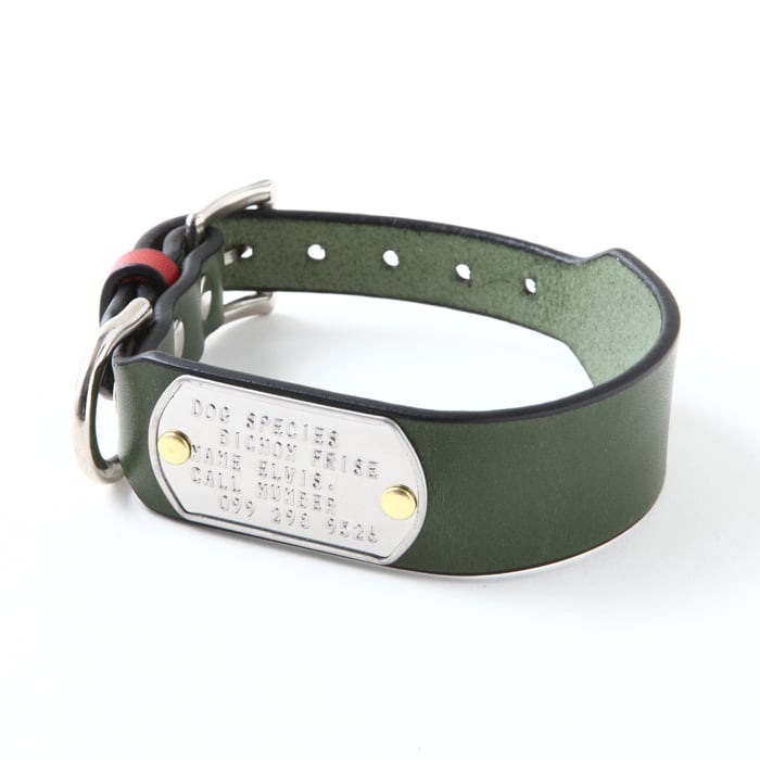 こちらの商品は、ドッグタグ一体型になっており、首輪の幅が30mm、バックルと剣先側が18mm幅になります。シンプルながら首輪本体の色・ベルトループの色・ドッグタグの色・剣先(首輪の先)・剣先に付属するスタッズの色(シルバーもしくはゴールド)を選べるのでオリジナルの首輪を製作出来ます。ドッグタグもアルファベットと数字で14文字×5列で刻印出来るので迷子札代わりになりますし、タグがアクセントになるのでスタイリッシュです。バックルやベルトループをカシメ(金具)で固定してますが、オプション(550円)で手縫い仕上げにも出来るので、デザインパターンが増やせます。首輪自体の強度は変わりません。こちらは、首輪本体が緑・ベルトループが赤・ドッグタグメッキあり・剣先ノーマル・スタッズ・シルバー・ドッグタグを付けるカシメ・ゴールドです。※受注生産になります。